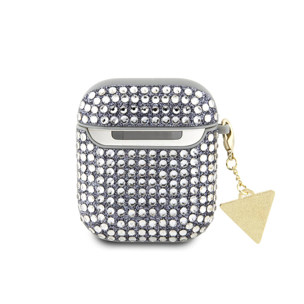Apple Airpods Kılıf Guess Orjinal Lisanslı Parıltılı Taş Kaplamalı Üçgen Logo Süs Zincirli Kapak Pembe