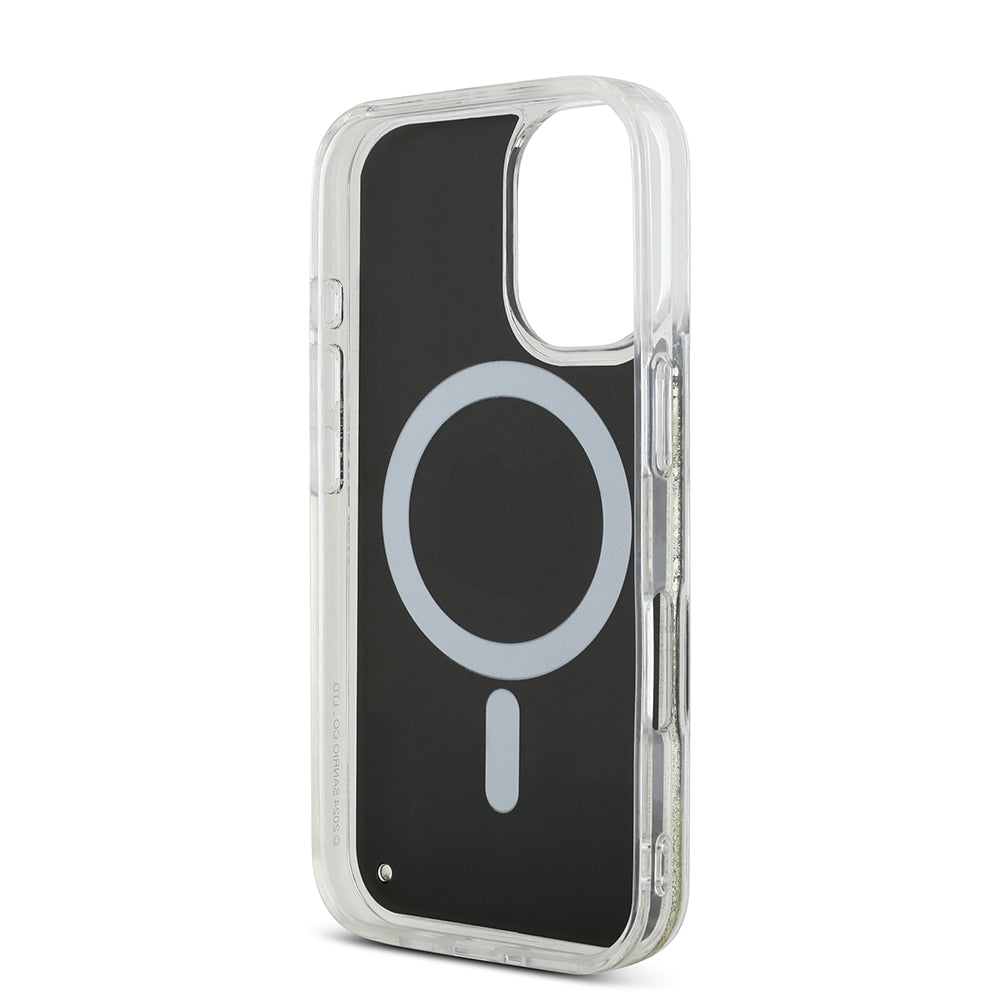 iPhone 16 Kılıf Hello Kitty Orjinal Lisanslı Magsafe Şarj Özellikli IML Baskı Kitty Head Logolu Sıvılı Simli Altın Ateşi Kılıf Siyah