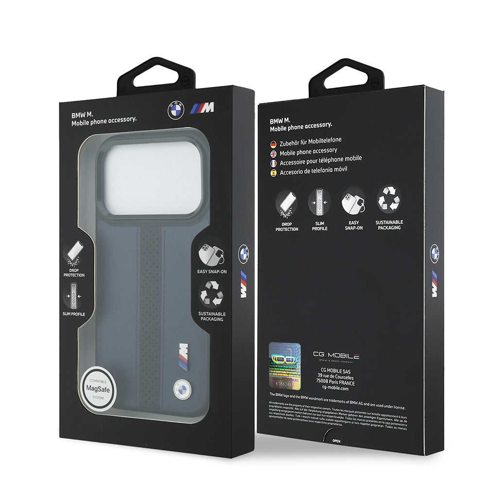 Apple iPhone 17 Pro Kılıf BMW Orjinal Lisanslı M-safe Şarj Özellikli Deri Arka Yüzey Metal Logolu Delikli Şerit Tasarımlı Kapak Mavi