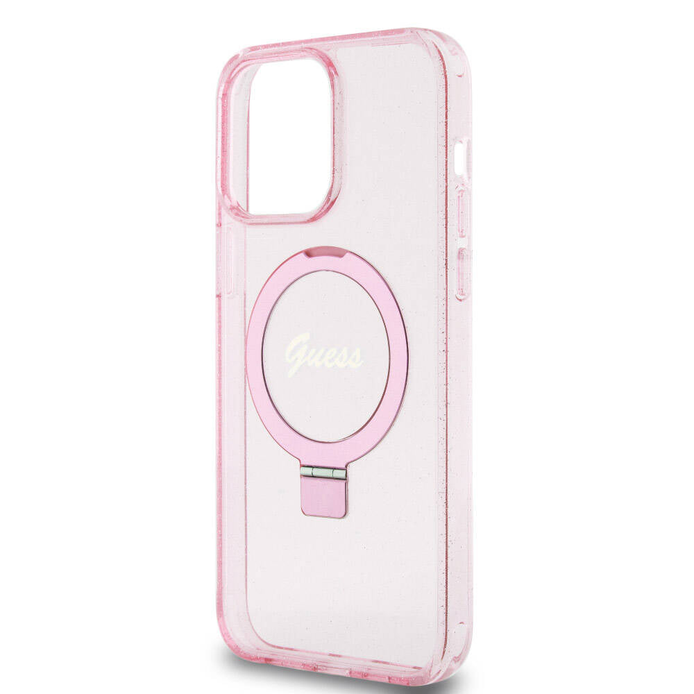 GUESS iPhone 15 Pro Orjinal Lisanslı Magsafe Şarj Özellikli Simli Arka Yüzey Ring Standlı Pembe Kılıf