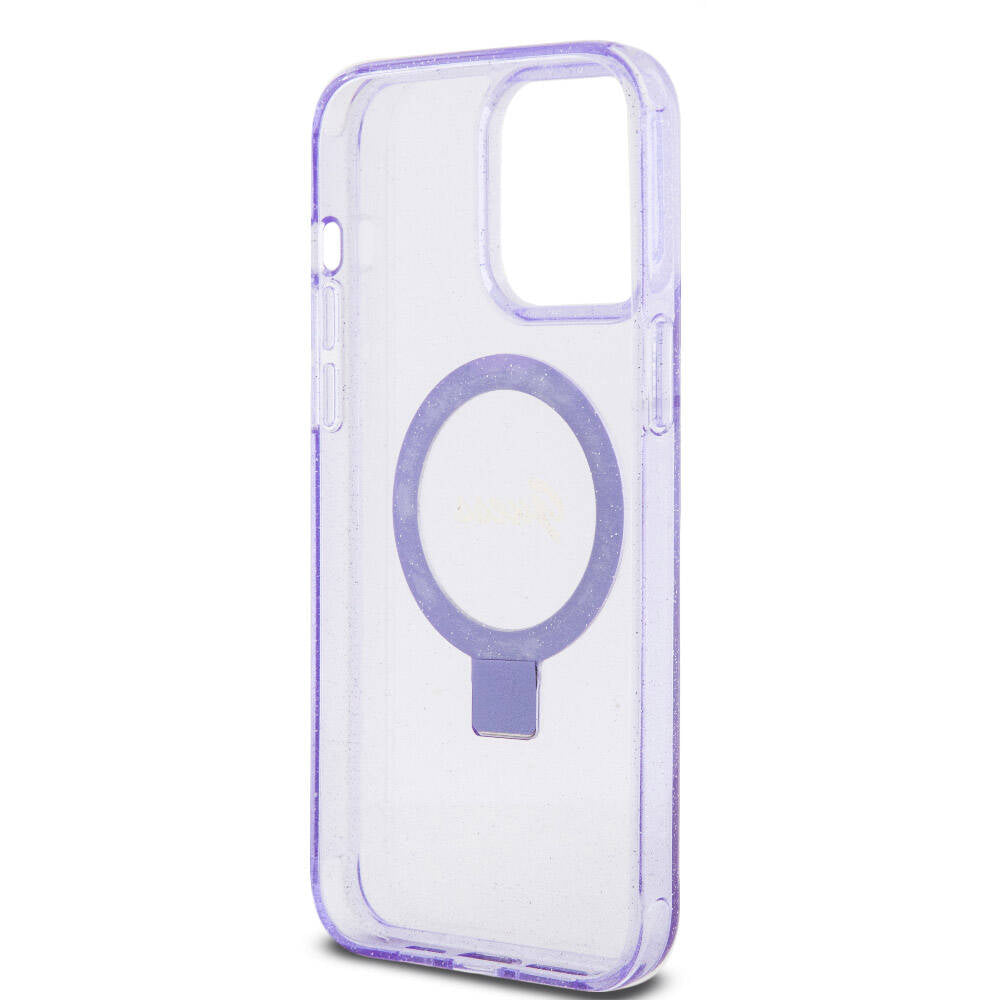 GUESS iPhone 15 Pro Orjinal Lisanslı Magsafe Şarj Özellikli Simli Arka Yüzey Ring Standlı Mor KIlıf