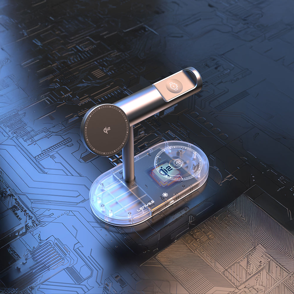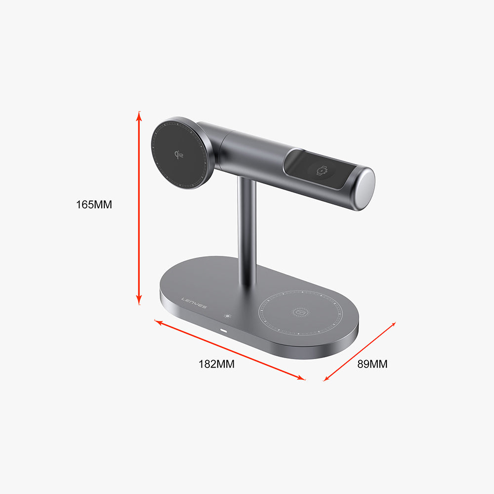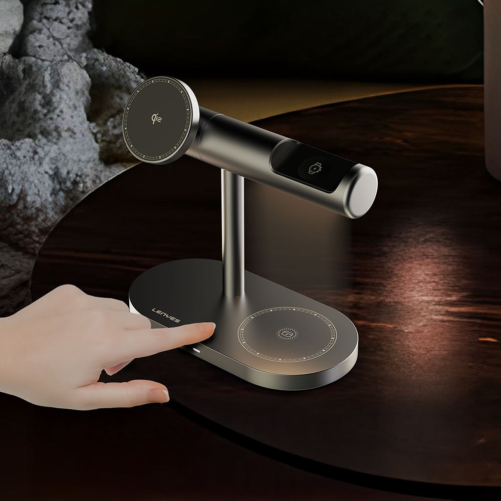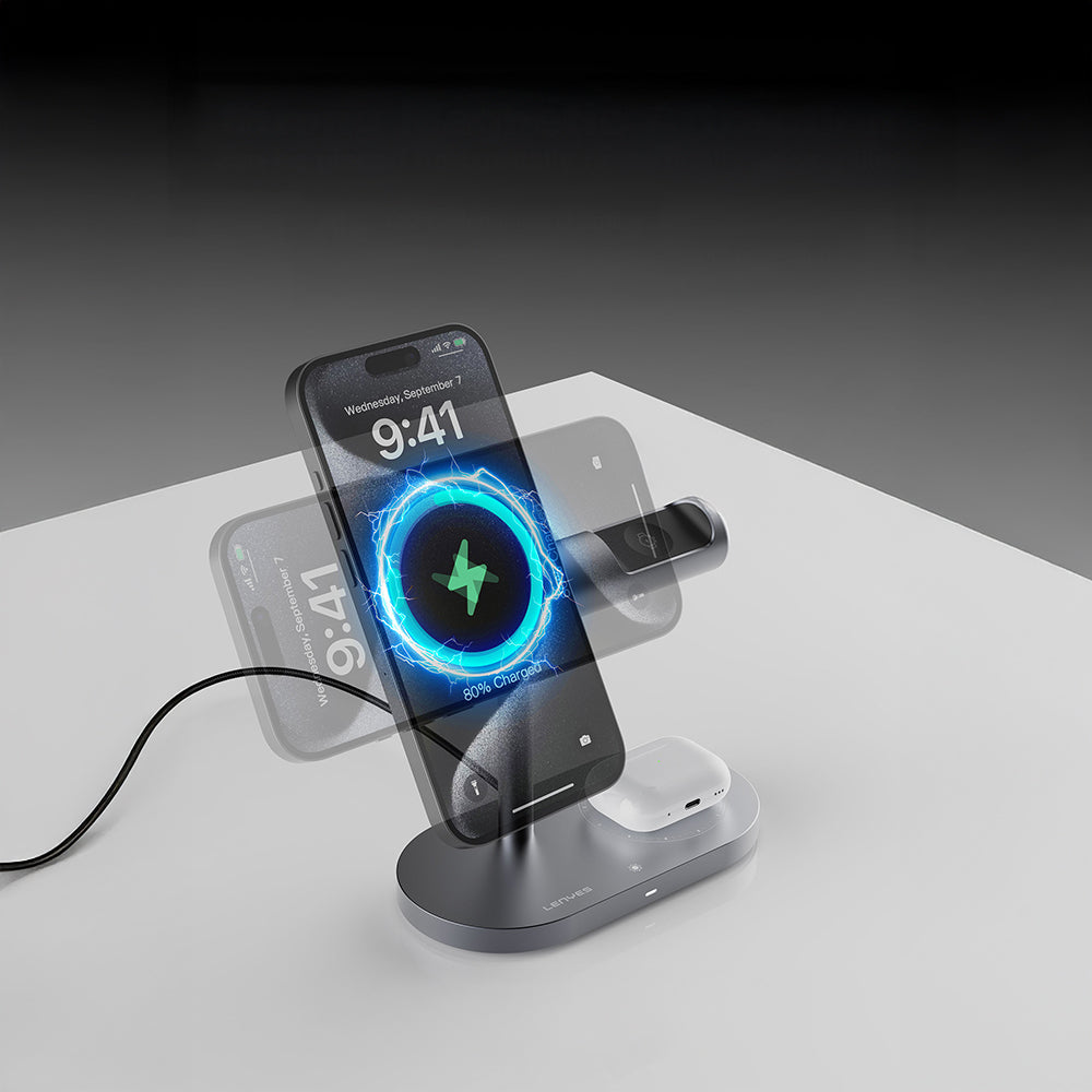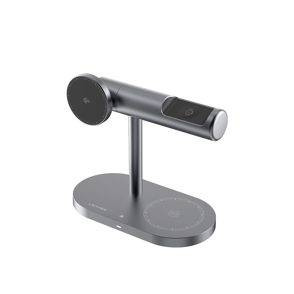 Lenyes PW319 Qi2 Şarj Teknolojili Ambiyans Işıklı Telefon&Akıllı Saat&Kulaklık 15W 3in1 Kablosuz Şarj Standı Gri