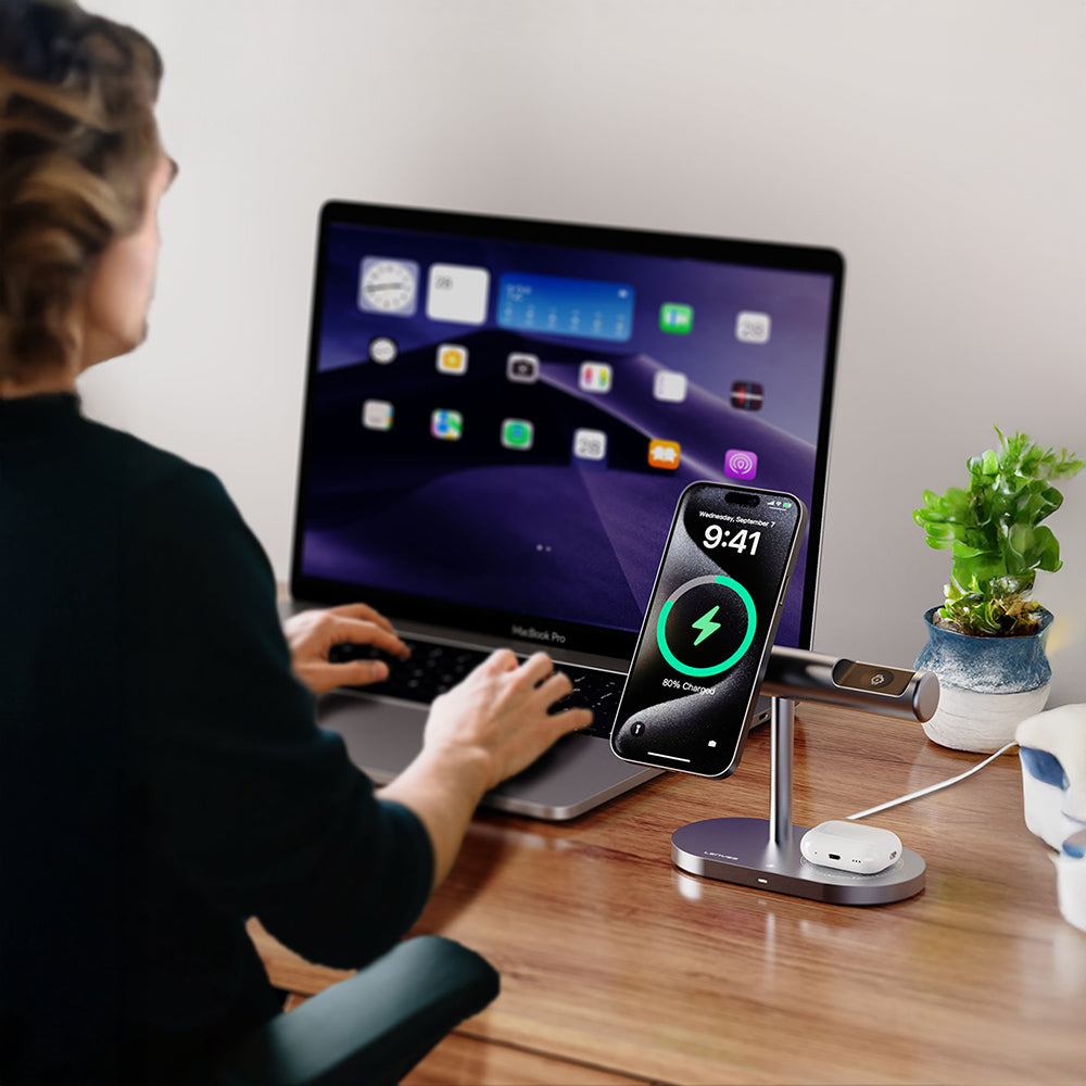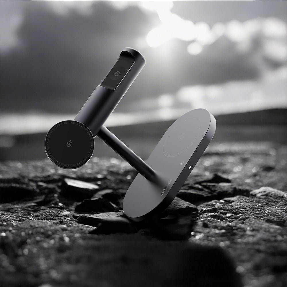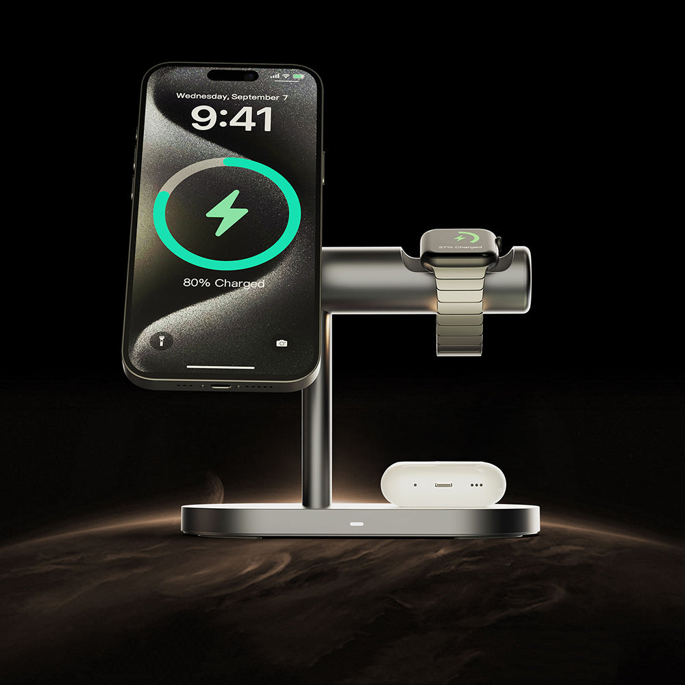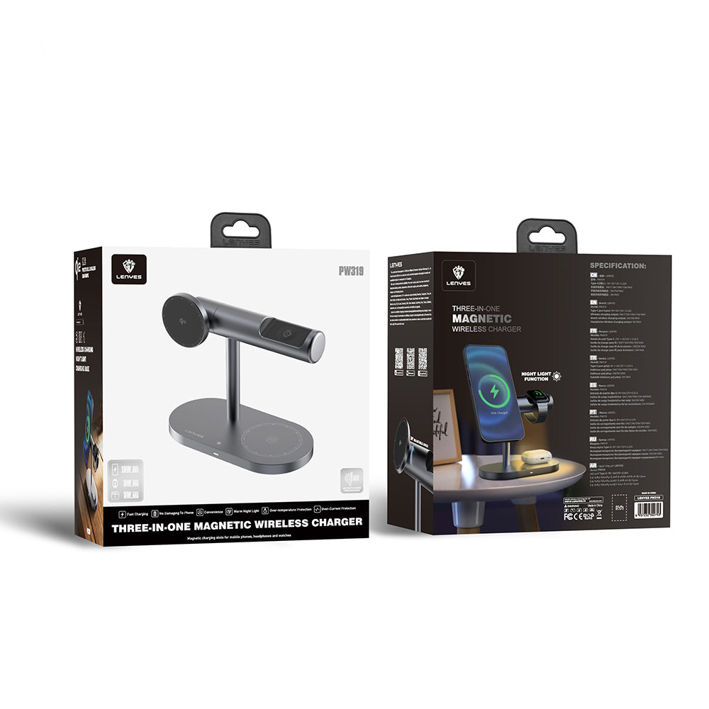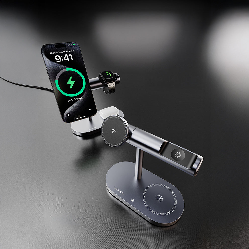 Lenyes PW319 Qi2 Şarj Teknolojili Ambiyans Işıklı Telefon&Akıllı Saat&Kulaklık 15W 3in1 Kablosuz Şarj Standı Gri