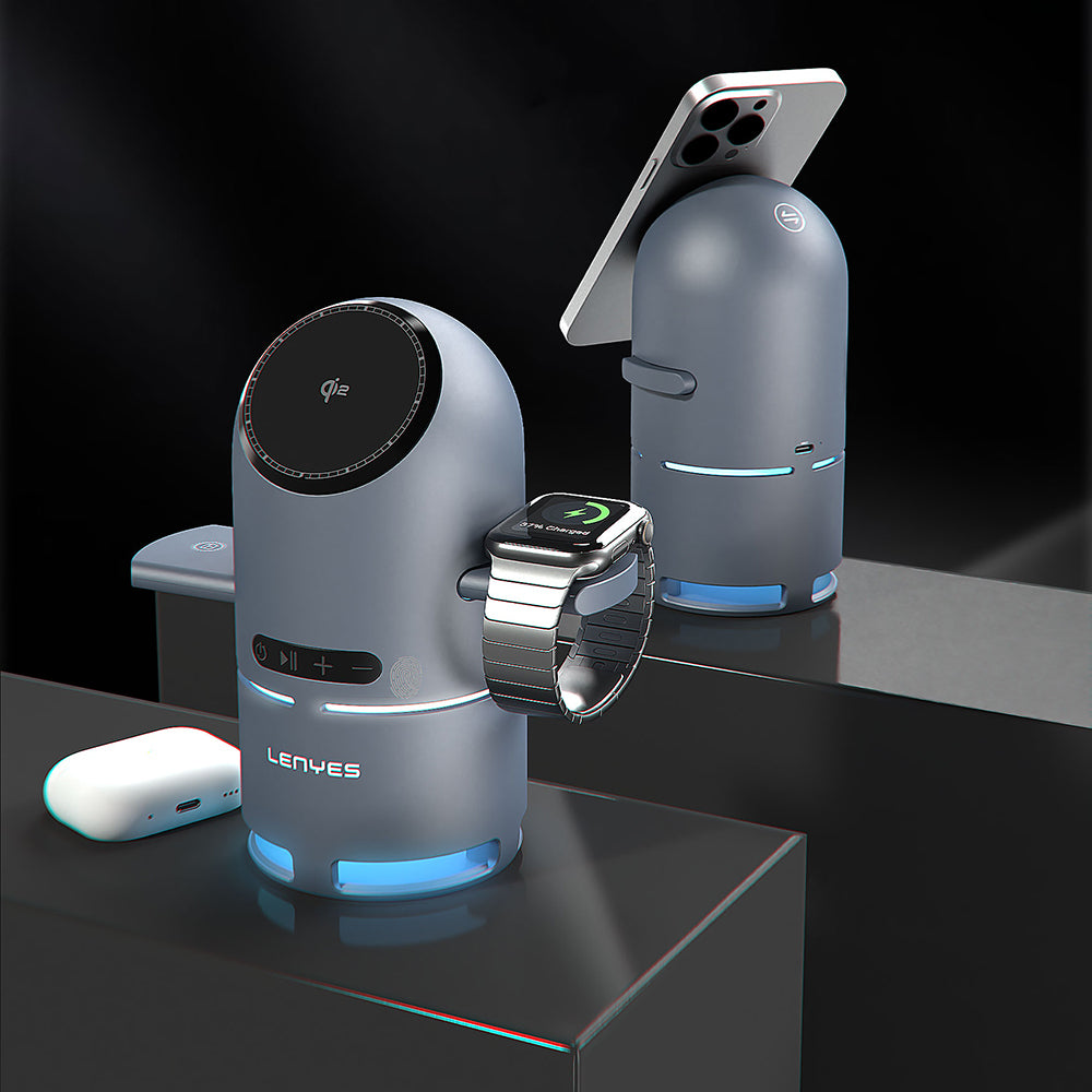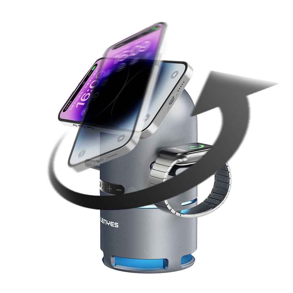 Lenyes PW321 Qi2 Şarj Teknolojili Bluetooth Speaker Hoparlör Özellikli Telefon&Akıllı Saat&Kulaklık 15W 4in1 Kablosuz Şarj Standı Gri